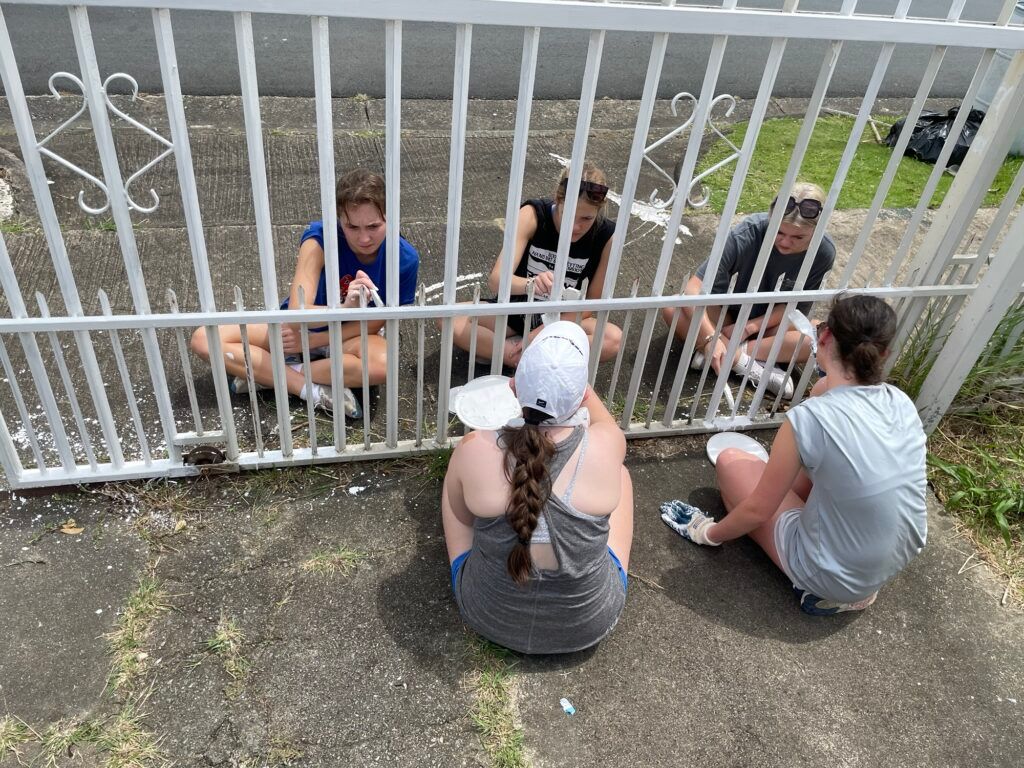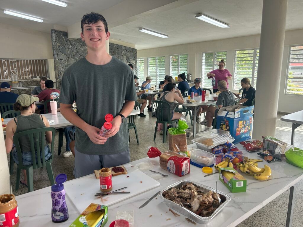 We have officially finished our first day of work in Puerto Rico! For our first day we woke up bright and early at 730 to get ready for breakfast at 8. Although some of us woke up at 7 to do some strength training by the pool with our very own Jon Strand. For breakfast we had oatmeal, scrambled eggs, and some meat! We headed over to do some morning worship and we meditated over the phrase “The Lord is my Shepherd, I shall not want” after worship we put on plenty of sunscreen and bug spray and hit the road to our first 2 houses. While some of our adults left to Home Depot to grab supplies, all youth played some fun indoor games for a while before eating our lunch that we prepared before breakfast. We split up into 2 groups and worked on two separate houses, one house needed a little bit of scraping and a lot of paint, and our second house needed more scraping some different colors of paint! We worked until around 4 pm and cleaned up. We realized that some of the youth forgot some items from home so we stopped at cvs where we grabbed snacks, drinks, and other needed items. After Walgreens we headed back to our current home, Cristo de Redentor, and we all took a much needed break before dinner. For dinner we had pasta, bread with olive oil, and salad, and some pineapple for dessert.